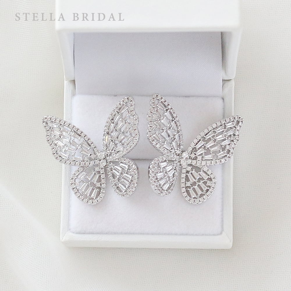 バゲットカットのキュービックジルコニアを蝶のデザインでセッティングした、大人な印象の華やかなブライダルピアス&イヤリング。