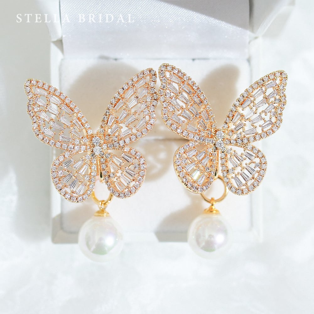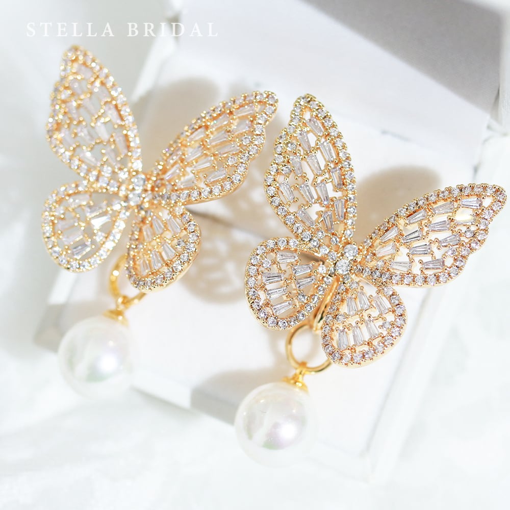 バゲットカットのキュービックジルコニアを蝶のデザインでセッティングした、大人な印象の華やかなブライダルピアス&イヤリング。