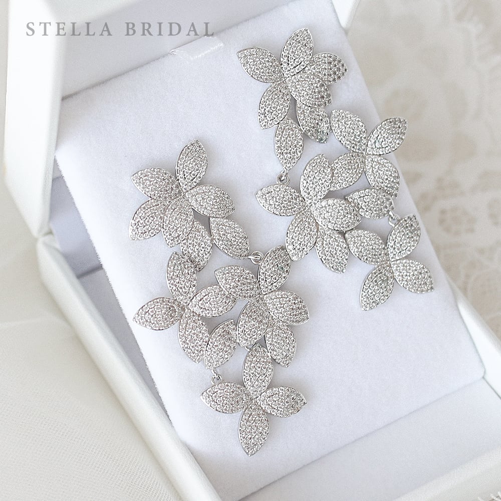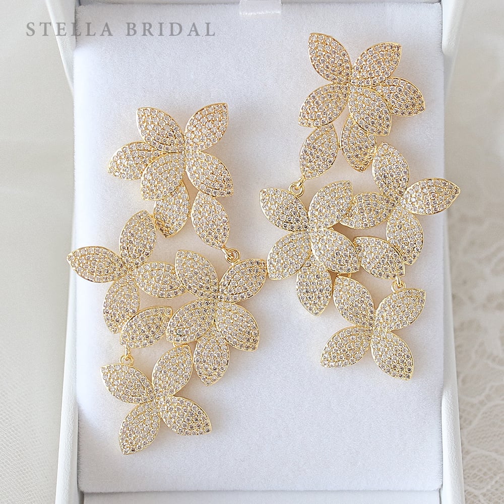 繊細なフラワーモチーフを連ねた、存在感あふれる大ぶりなロングピアス(イヤリング)。