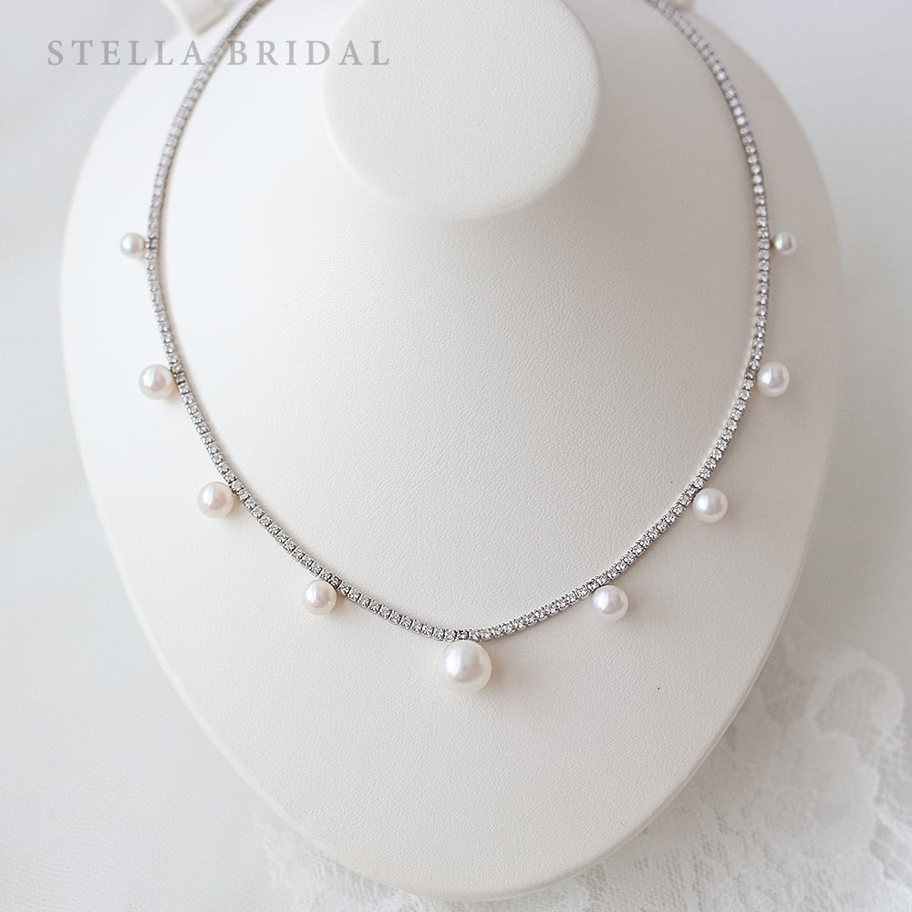 繊細なテニスチェーンに厳選された淡水パールをあしらった、エレガントなステーションネックレス。