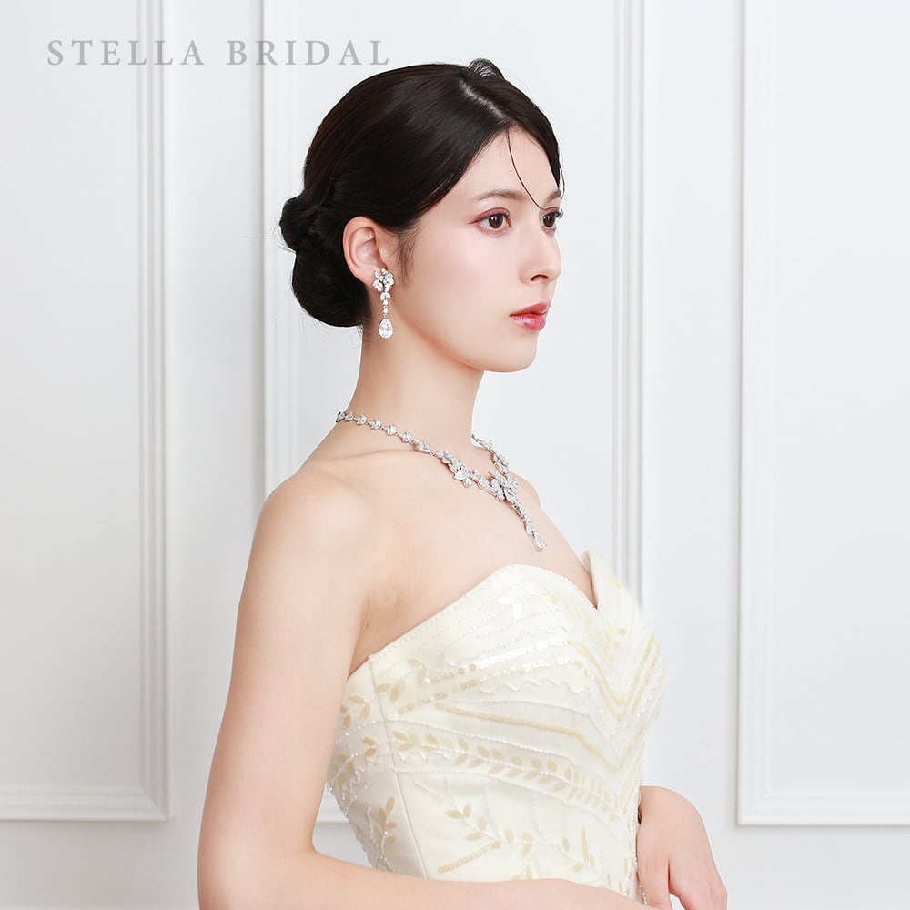 このウェディングジュエリーはまるでダイヤモンドの様な輝きで見る人を惹き付け、最高の日を迎える花嫁様をより美しく、ドラマチックに演出します。