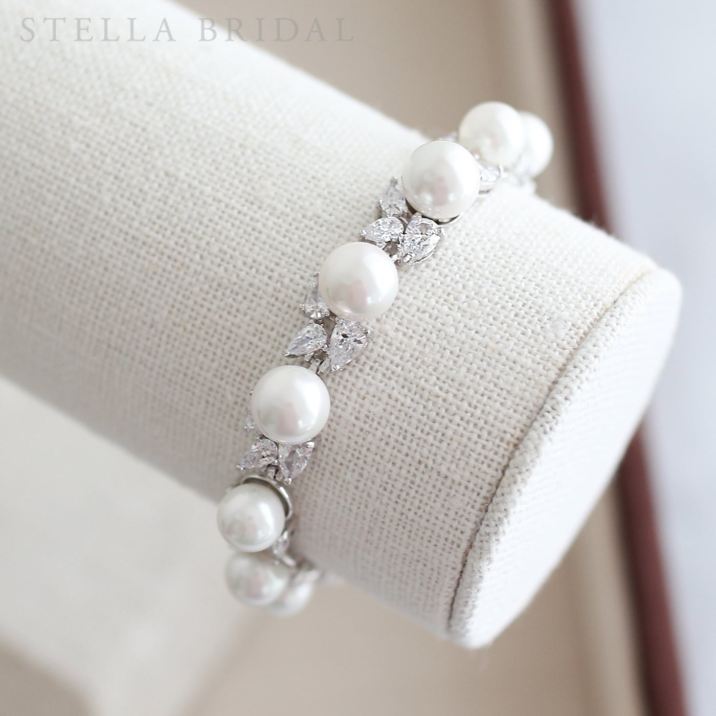 大粒シェルパールとジルコニアをリーフのデザインであしらった美しいウェディングブレスレット。