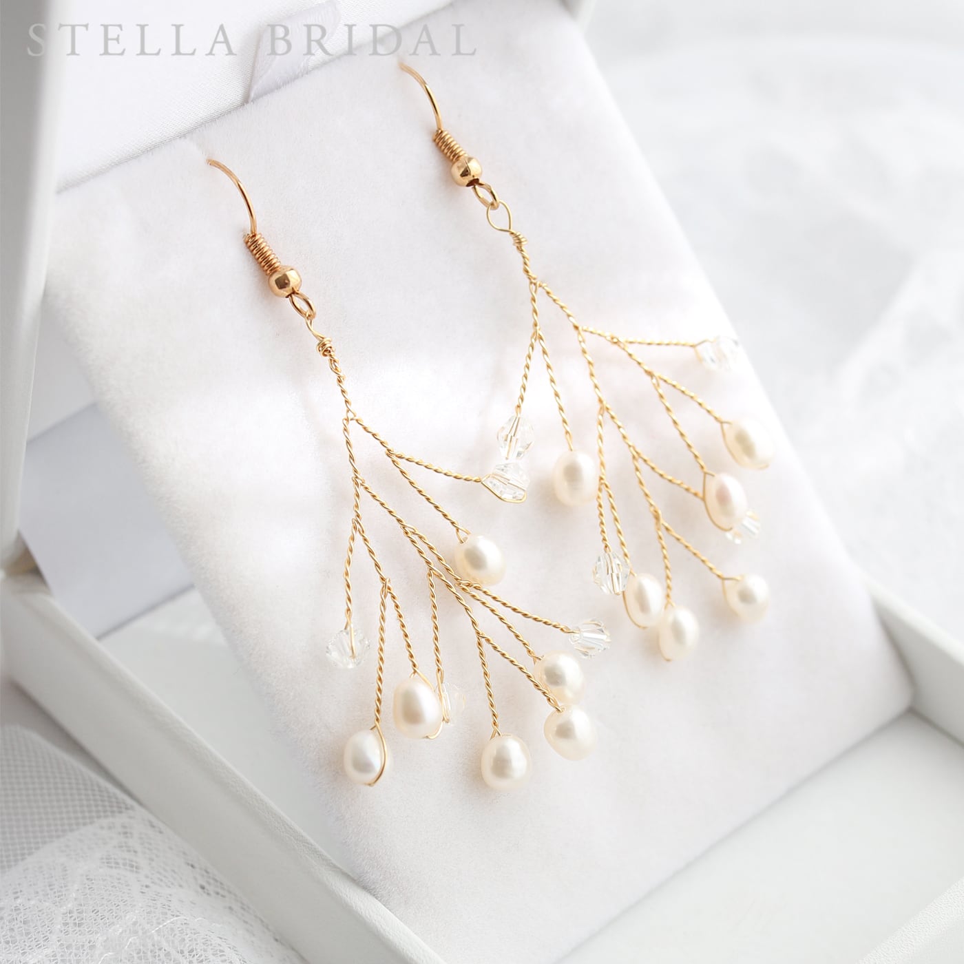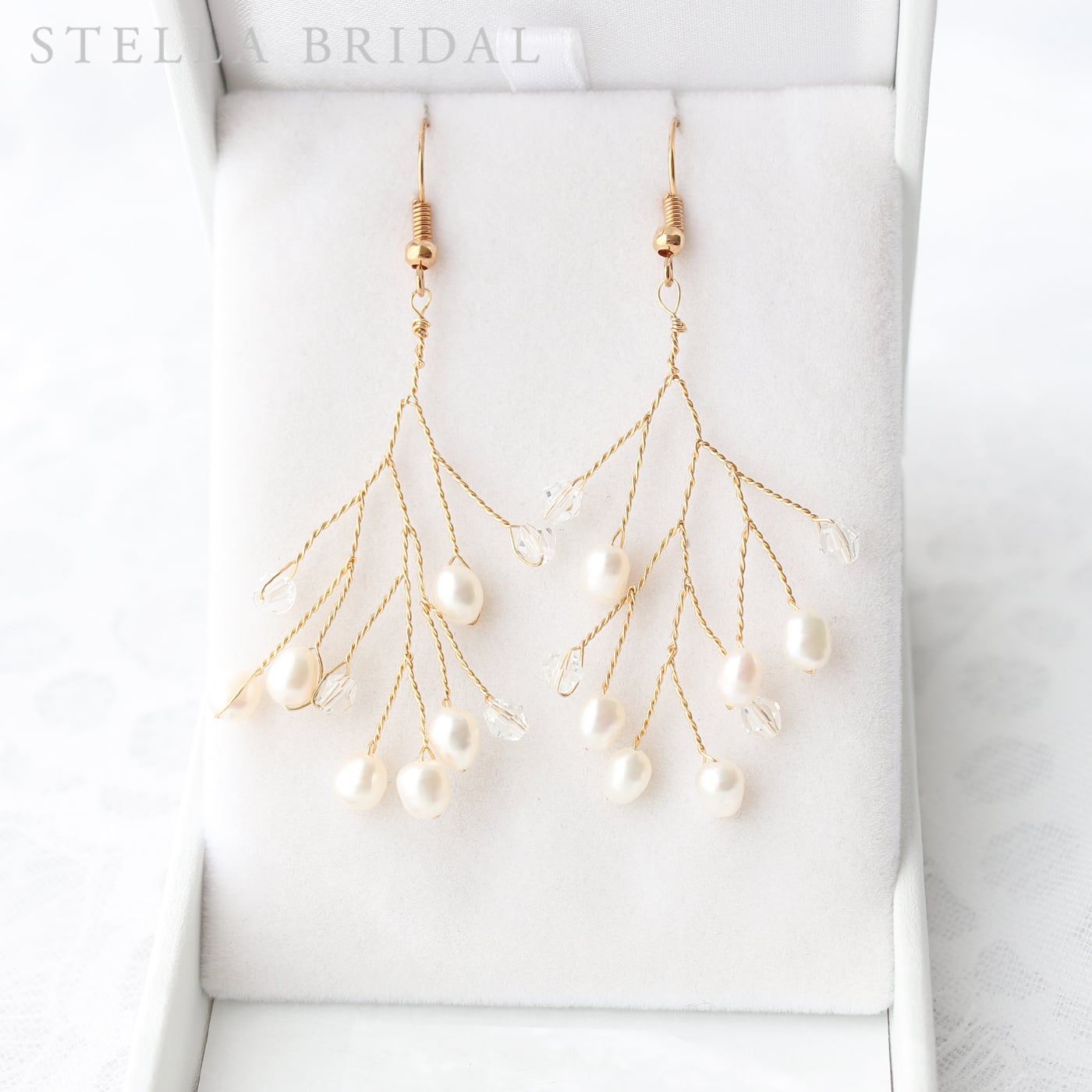 オーガニックパールとクリスタルビーズを丁寧にワイヤリングした、ナチュラルで繊細なブライダルイヤリング&ピアス。