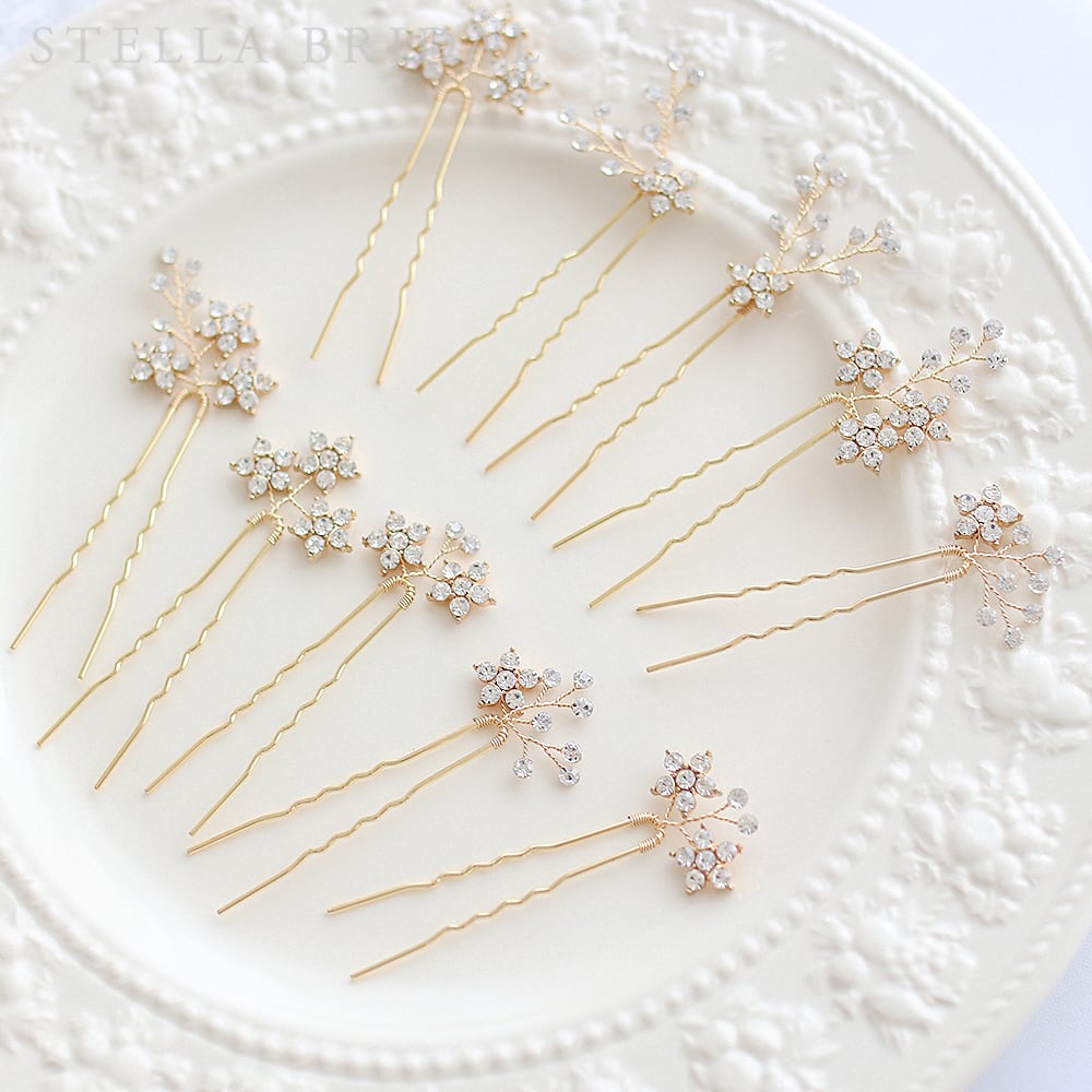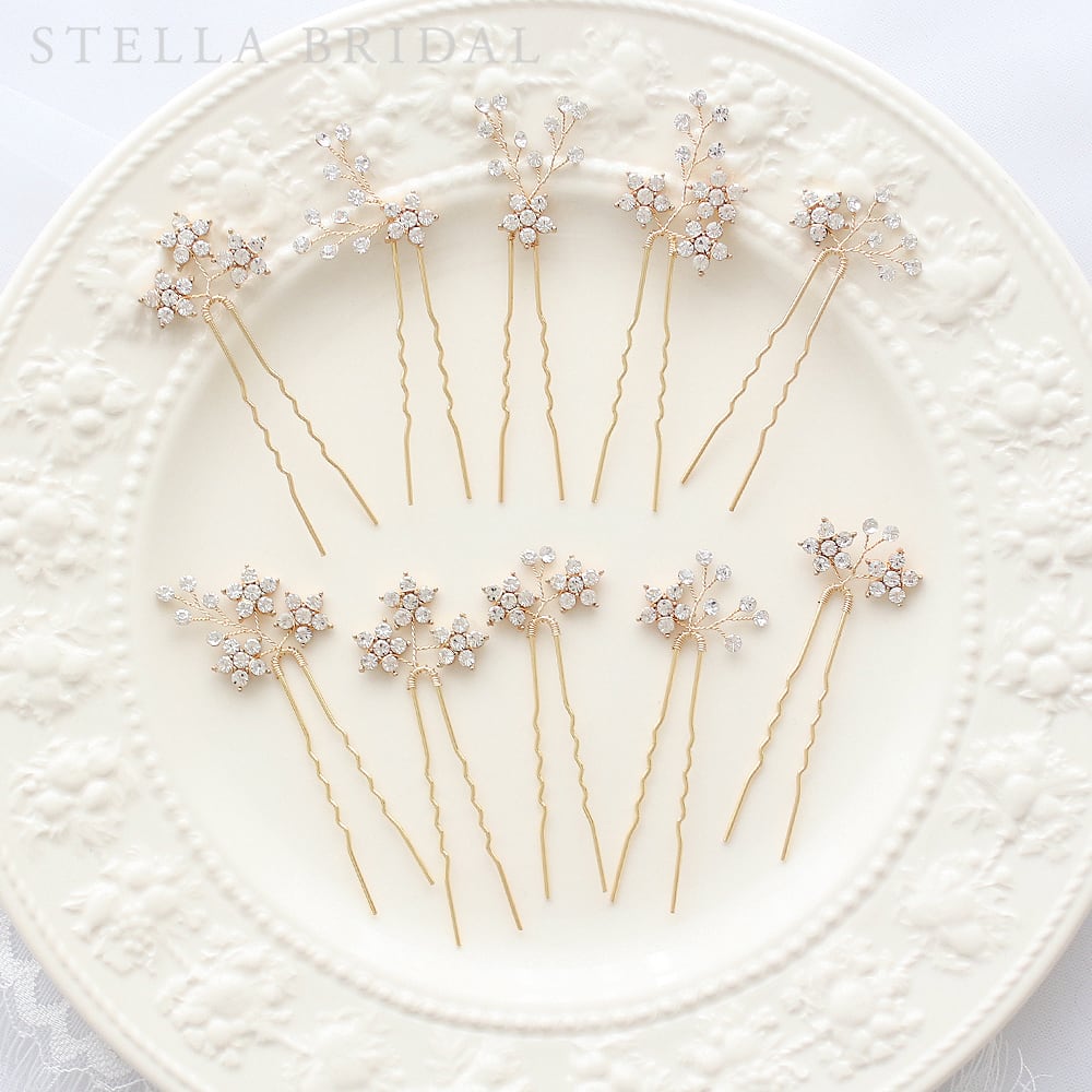 ヘアスタイルにかんたんにアクセント加えられるスモールヘッドピースは、ピンを連ねてヘッドドレスのようにあしたったり、ローポニーやダウンスタイルなどのヘア全体に散らしたり、10ピースのセパレートタイプのため様々なアレンジを楽しんで頂けます。