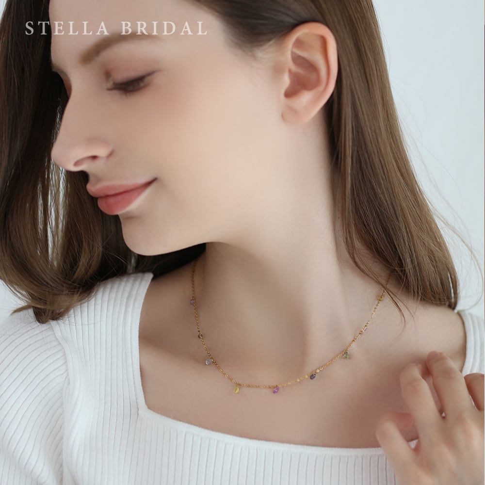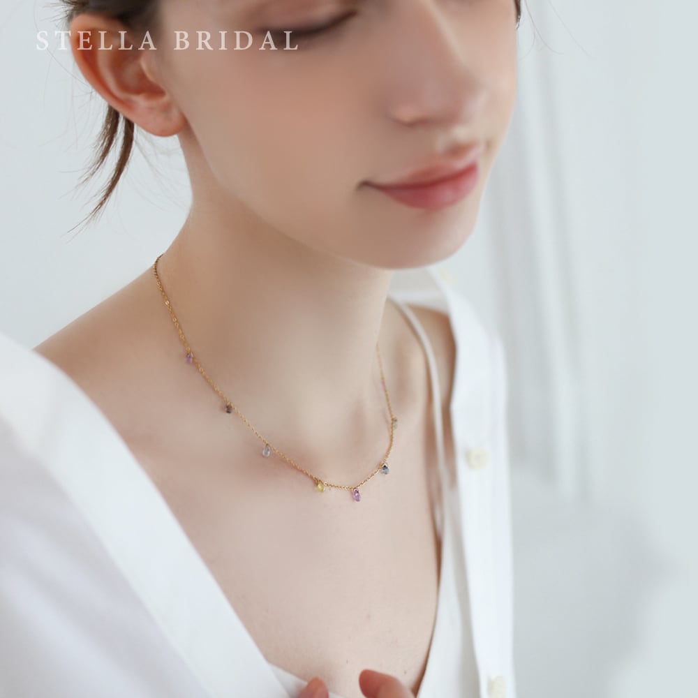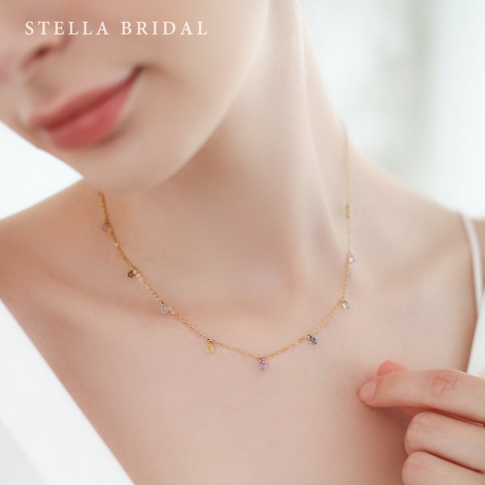 極細のチェーンに肌馴染みの良い色合いを厳選したセッティングで、デコルテをすっきり華奢な印象に。