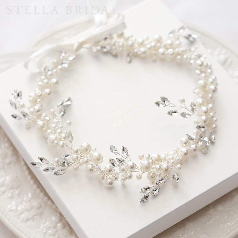 ボリューミーにパールを編み込み、美しい輝きのオーストリアンクリスタルを贅沢に使用したStella Bridalオリジナル仕様。