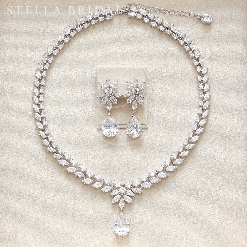 AAA(トリプルA)グレードの大ぶりのキュービックジルコニアが輝く、存在感抜群のブライダルイヤリングとおそろいのネックレスがセットになったジュエリースイート。